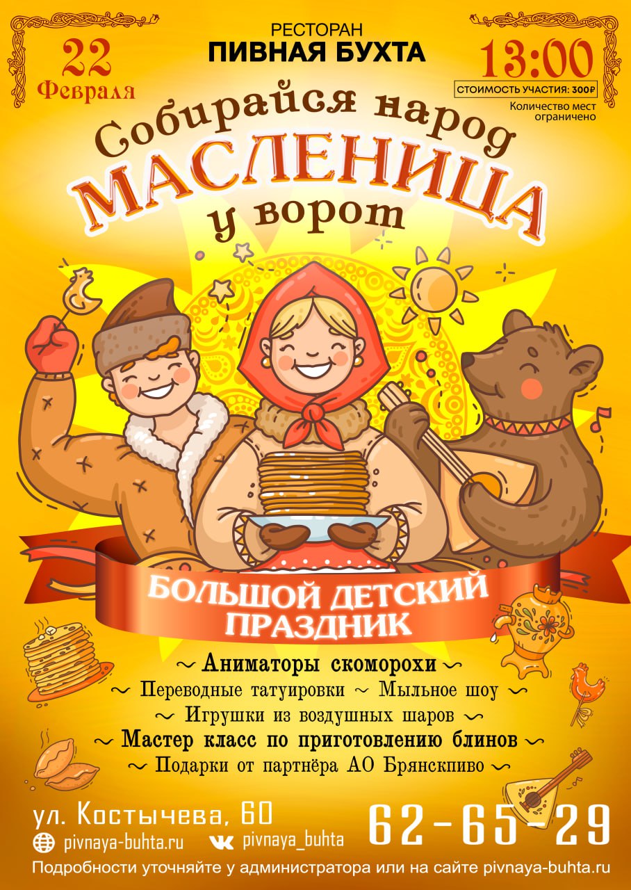 Провожаем зиму шумно, вкусно и весело! Ресторан «Пивная Бухта» приглашает детей и родителей на большой и яркий Масленичный праздник!